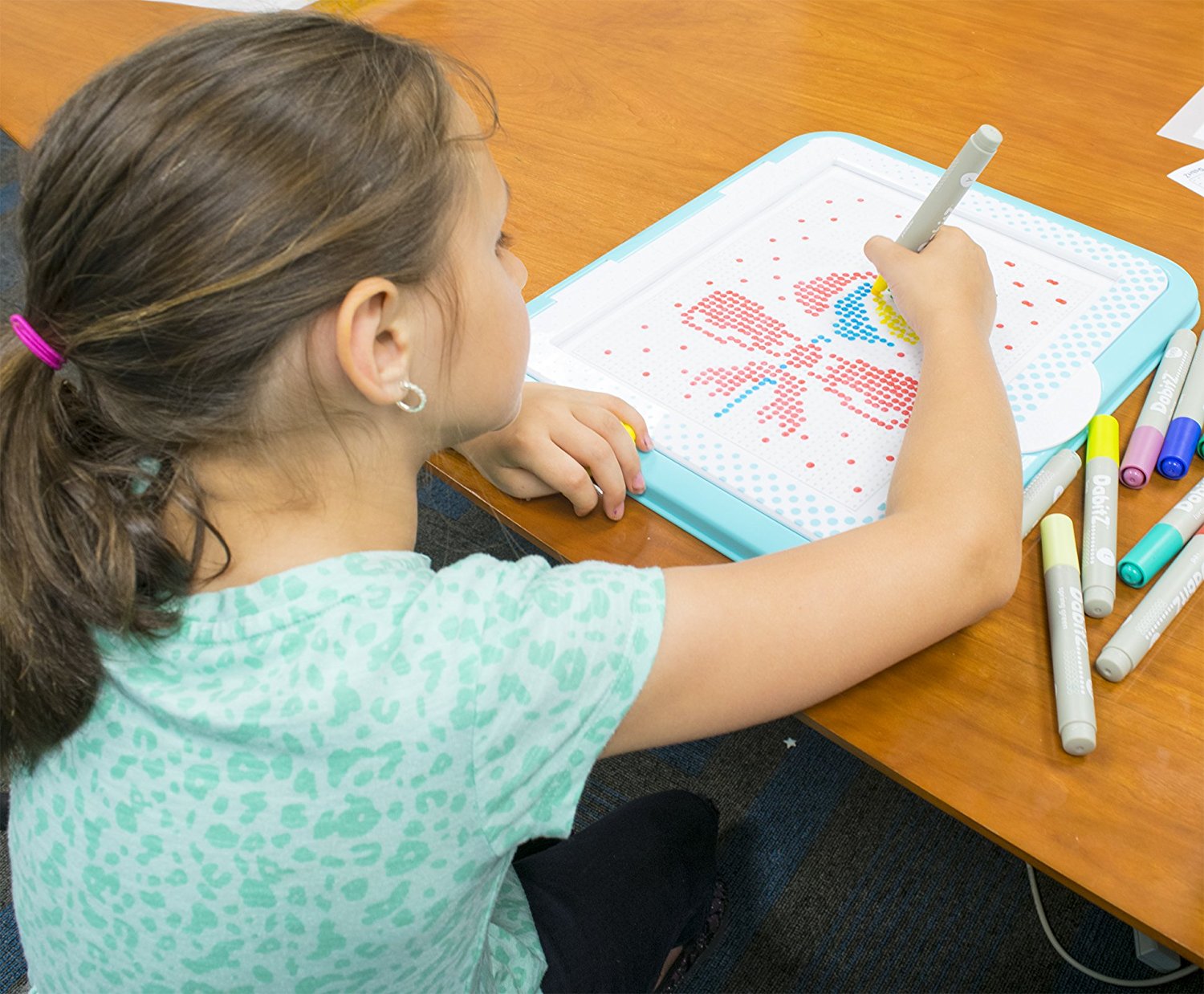 Dabitz Learner Desk Top-this is one of my favorite additions to this year’s gift guide and great for older children who love to craft. Basically, kids take a picture of whatever they want, convert it to a pixelated image using the app that you can download and then print it out. It comes out of the printer with a pattern to follow using the 12 dabbers (special markers). Kids use the dabbers to fill in the picture (each color coordinates with a certain letter) This set comes in a portable case for your kids to take on the go and will keep your kids entertained for hours. It works on improving graphomotor skills, visual motor and visual perceptual skills, hand-eye coordination and executive functioning skills such as focus, attention, planning and organizational skills.