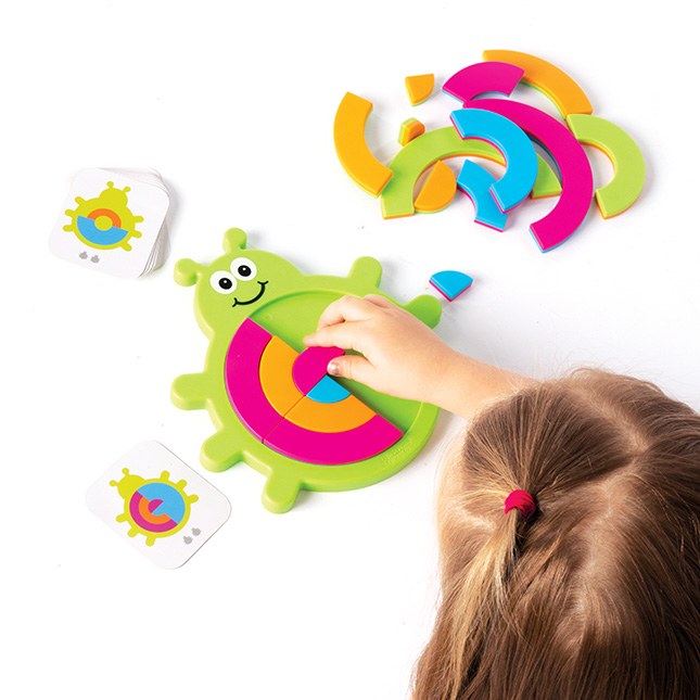 Buggzle-I like this puzzle game for a variety of reasons. First of all, I like that it is small and can be thrown in a bag to keep kids entertained while waiting for an appointment, while traveling or in a restaurant. Kids pick one of the 40 challenge cards and then have to use the puzzle pieces to make their bug match what is shown on the card. This game is a great way to work on developing fine motor and grasping skills, encourages spatial reasoning, hand-eye coordination, problem-solving, critical thinking, focus, attention and organizational skills.