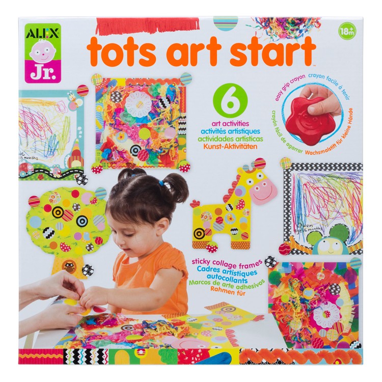 Tots Art Start-this is such a great starter art kit by Alex Jr. for toddlers who are still acquiring fine motor skills and working on the ability to focus and complete tasks presented to them. This kit comes with all the materials needed for 6 activities…shaped paper for decorating, shredded paper for adding to collages, doilies, colored tissue papers, triangle-shaped crayons (great for encouraging a proper grasp), stickers and two frames around peel and stick center areas. This art kit is great for working on developing fine motor, grasping and manipulation skills in toddlers, works on building focus, attention and task completion and encourages creativity and imagination using a variety of different materials and offers sensory exploration in toddlers which is essential for the development of a variety of skills.