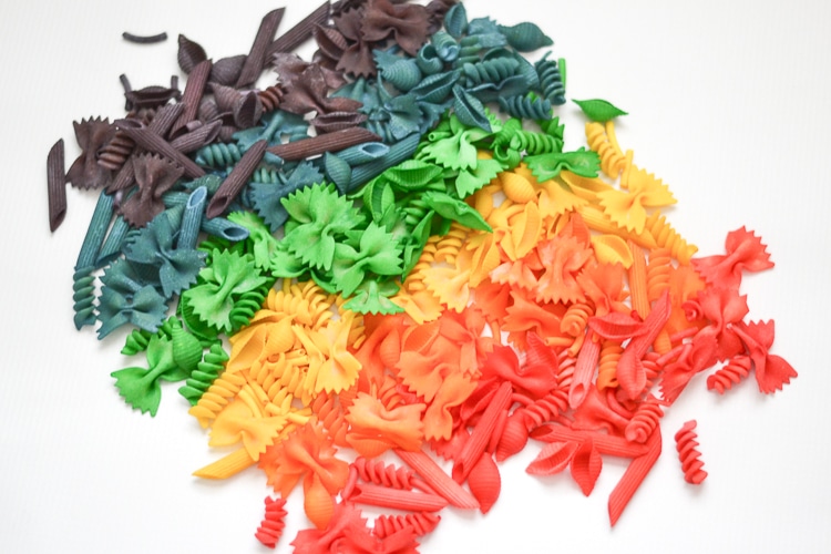 Dye Rice/Noodles-another great sensory experience and kids can be part of the whole experiences of making it. Kids will love watching the plain rice or pasta go from plain to brightly colored sensory materials. For each color, you need 1 cup of white rice/baby pasta, 1 tablespoon vinegar and desired amount of food coloring. Have kids help you by pouring the rice and vinegar into little Tupperwares and squeezing a few drops of food coloring. Close the lid and then have them shake the Tupperwares until the rice/noodles are all covered. If you make some of each color, you can pour them into a much bigger Tupperware and hide little characters or animals in it and and have him dig through using their hands or spoons or scoopers to rescue them. Another fun activity is to dye penne or rigatoni noodles and have kids make necklaces out of them.