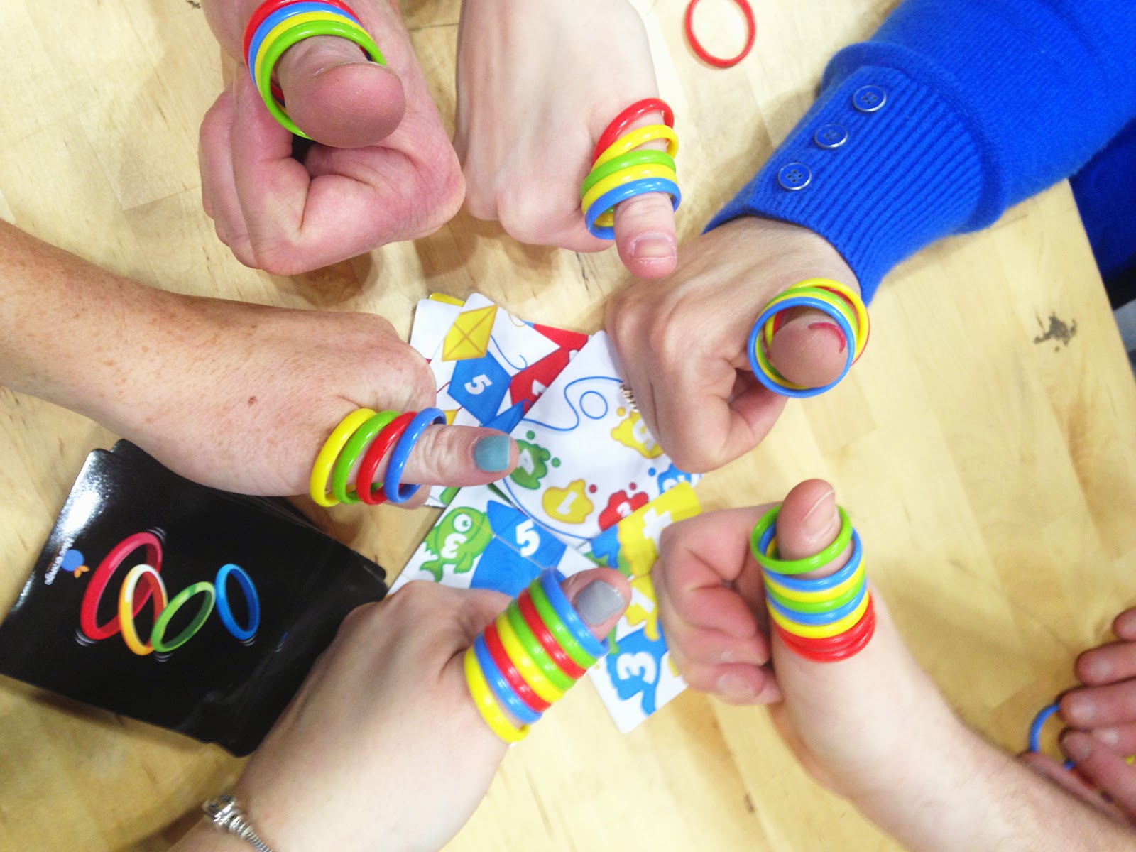 Thumbs Up-I’m always excited to see new games by Blue Orange Games. I was in an Upper East Fantastic Kids Toys, and one of the employees there suggested I try out Thumbs Up. It’s become a fast favorite of mine and every kid that I have used it with at work. Like all the other games/activities I have written about, I have included this on a summer list because of how light and easy it is to travel with. Take it out of the box, throw it in a ziploc bag and you can throw it in a travel bag…it could be a great game for a plane ride or family game nights when on vacation. Thumbs Up is a fast-paced game that works on improving visual skills such as visual motor, visual perceptual, visual tracking and visual attention. It can also work on improving color and number recognition. The game consists of 4 different colored rings and a stack of cards; the cards all have fun pictures with numbers and colors. The point of the game is simple: each player is given 8 rings (2 of each color), the cards are placed in the middle of the group and each player takes a card. The first person to correctly put their rings on their thumb in the order wins that round. The first person to get 5 cards is the winner of the game. For a game to be a true winner for me, it’s important that it be easily adaptable for kids of different ages and cognitive levels. Thumbs Up is great because you can sift through the cards and finds one that will be appropriate for younger children.