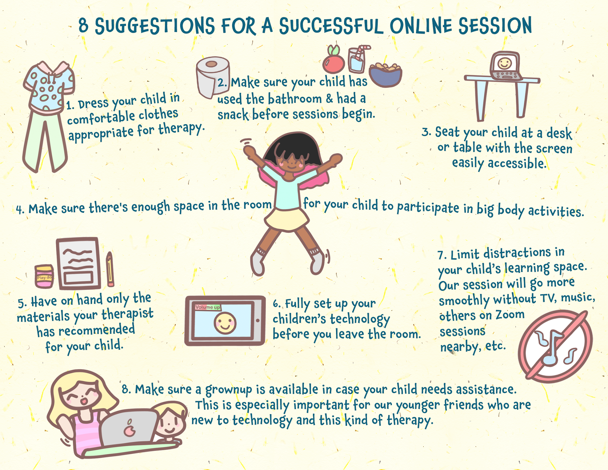 Unlike March and April when we were all trying to figure out this new way of doing therapy, I feel so much more prepared and ready for whatever gets thrown at us this school year. Not only do I feel more prepared, I have figured out how I can support parents and caregivers for these sessions to be more successful by setting up the environment. With the help of my daughter (illustrator) and my husband (graphic designer), I have created this infographic that I will be sharing with all of my families before we begin online therapy sessions. The suggestions made are not exclusive to therapy sessions and can be used to make distance learning and online extra-curricular activities