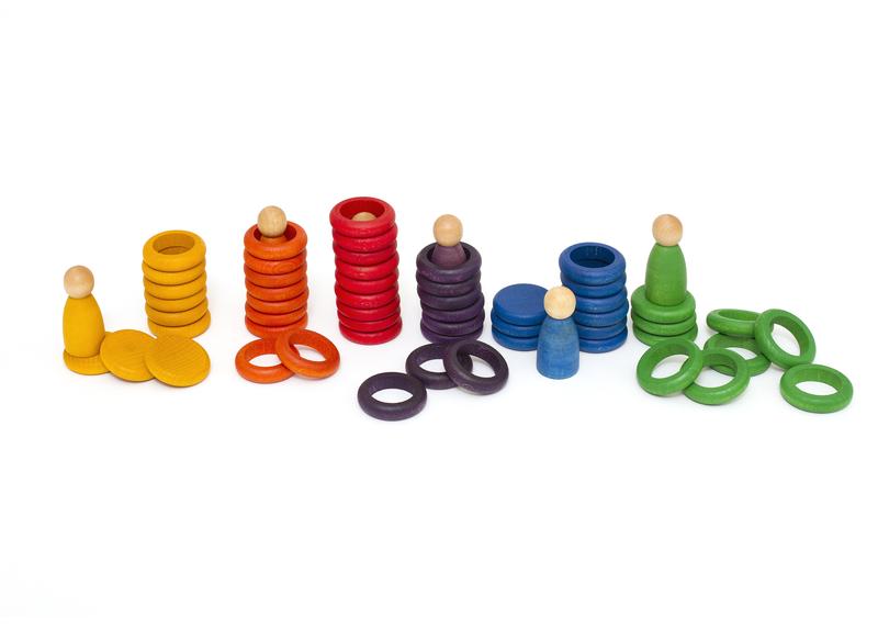 Grapat Nins Carla Wooden Figures Game-over the last few months, I have been adding more open-ended toys to my therapy sessions. I am a sucker for nice wooden toys and am pretty much can’t not buy something if there’s a rainbow them to it. This set of rainbow dolls is of my new favorites and I have loved watching my kids play with them. As you can see from the picture, the set comes with 6 colored peg dolls with matching discs and rings. I love how many occupational therapy skills can be worked on while also encouraging open-ended play in children. Some of the skills that can be worked on are color identification, sorting, categorizing, improving hand-eye coordination and grasping and manipulation skills. These are also great for improving focus, attention and self-regulation because you need to concentrate and take your time while stacking the rings and discs. I have found these are great to combine with some of my gross motor activities when at the gym. For example, I will have them sort and stack while lying prone in the net swing so we are adding a strengthening component to a fun fine motor activity.